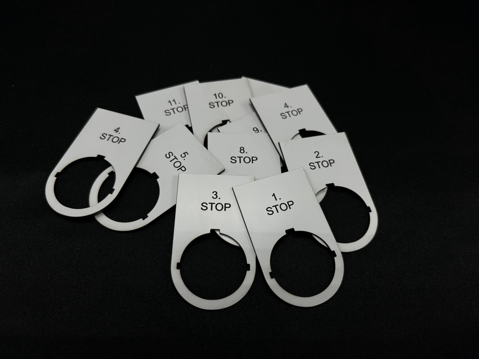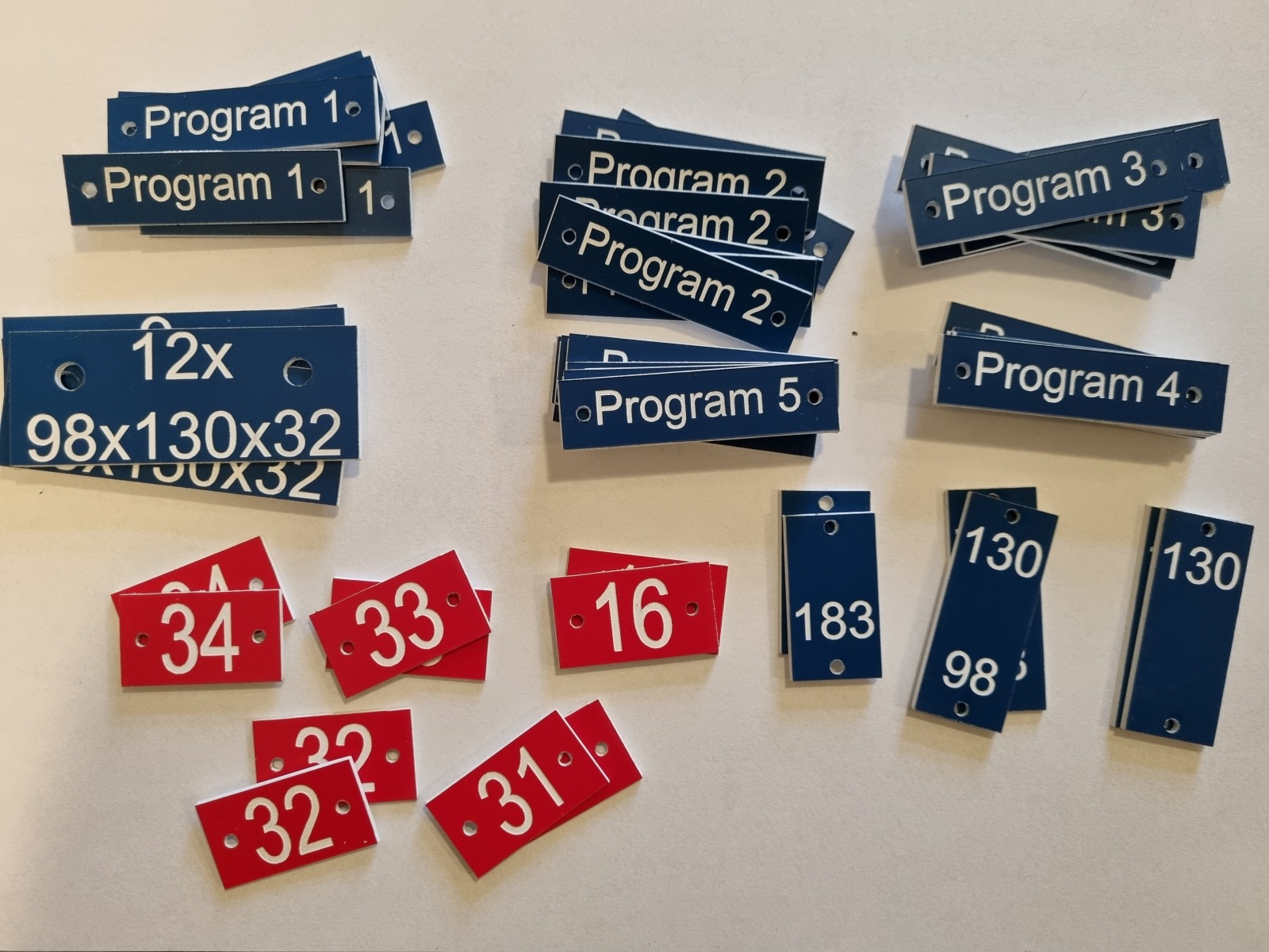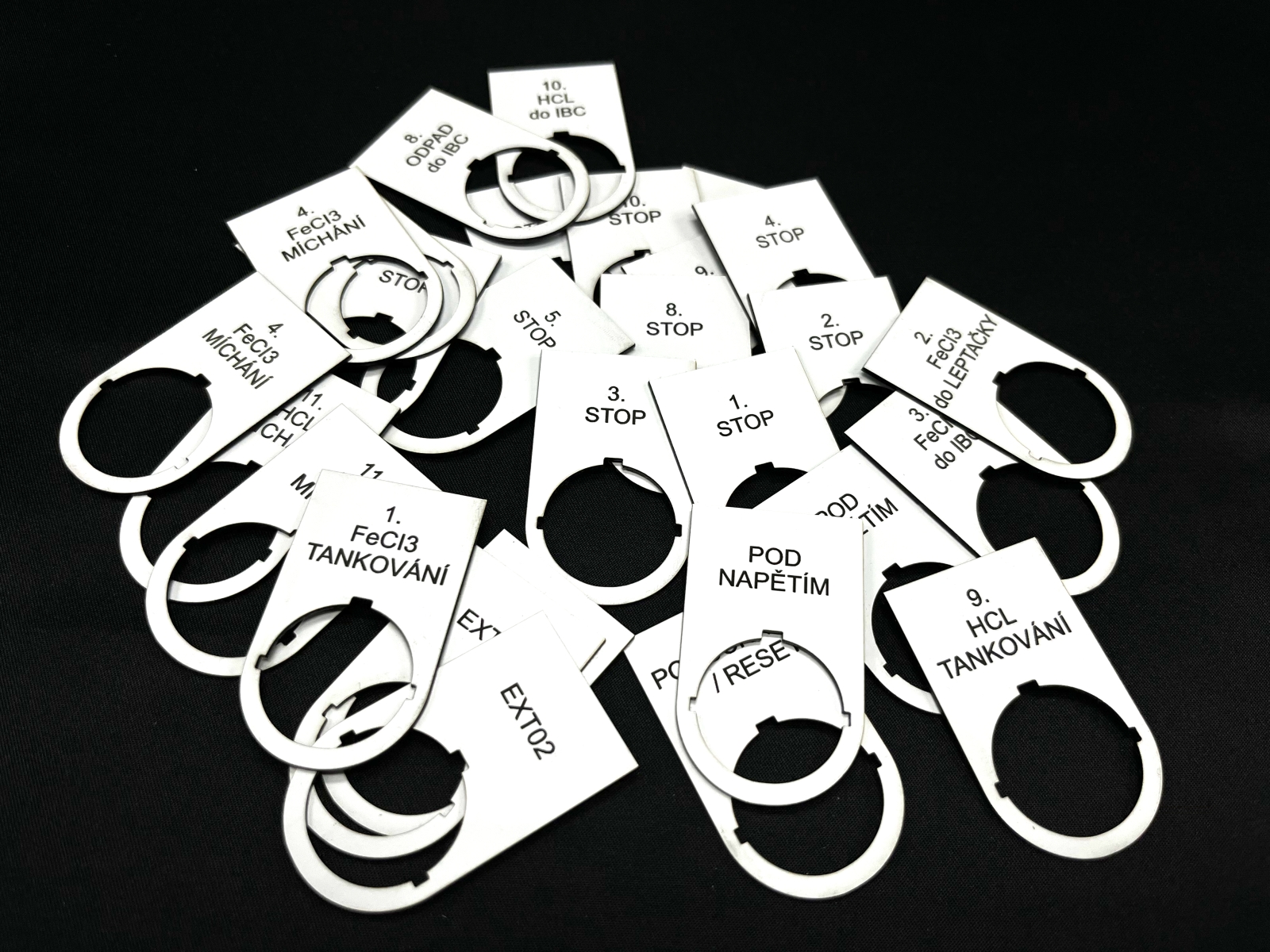 - Číslování a evidenční štítky – Štítky s čísly a číselnými řadami pro označení dílů, výrobků a pozic.
