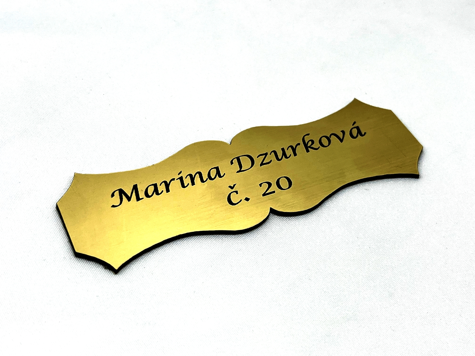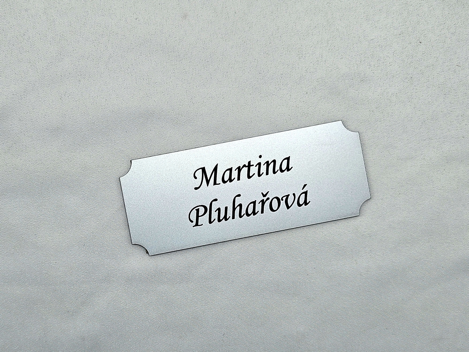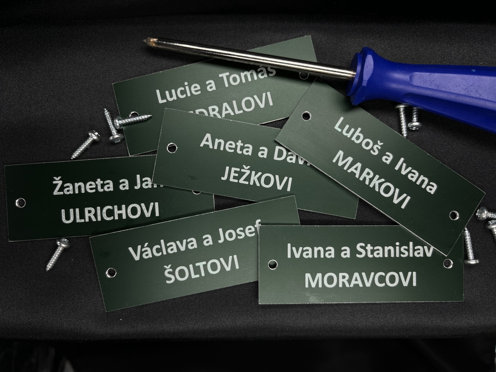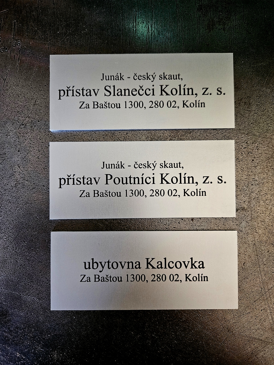- Jmenovky a štítky na dveře / schránky – Jednoduché štítky pro označení dveří, schránek nebo zvonků. Vhodné pro domácnosti i provozovny, stejně jako personalizované jmenovky a pamětní štítky (např. na poháry, psí známky nebo urny).