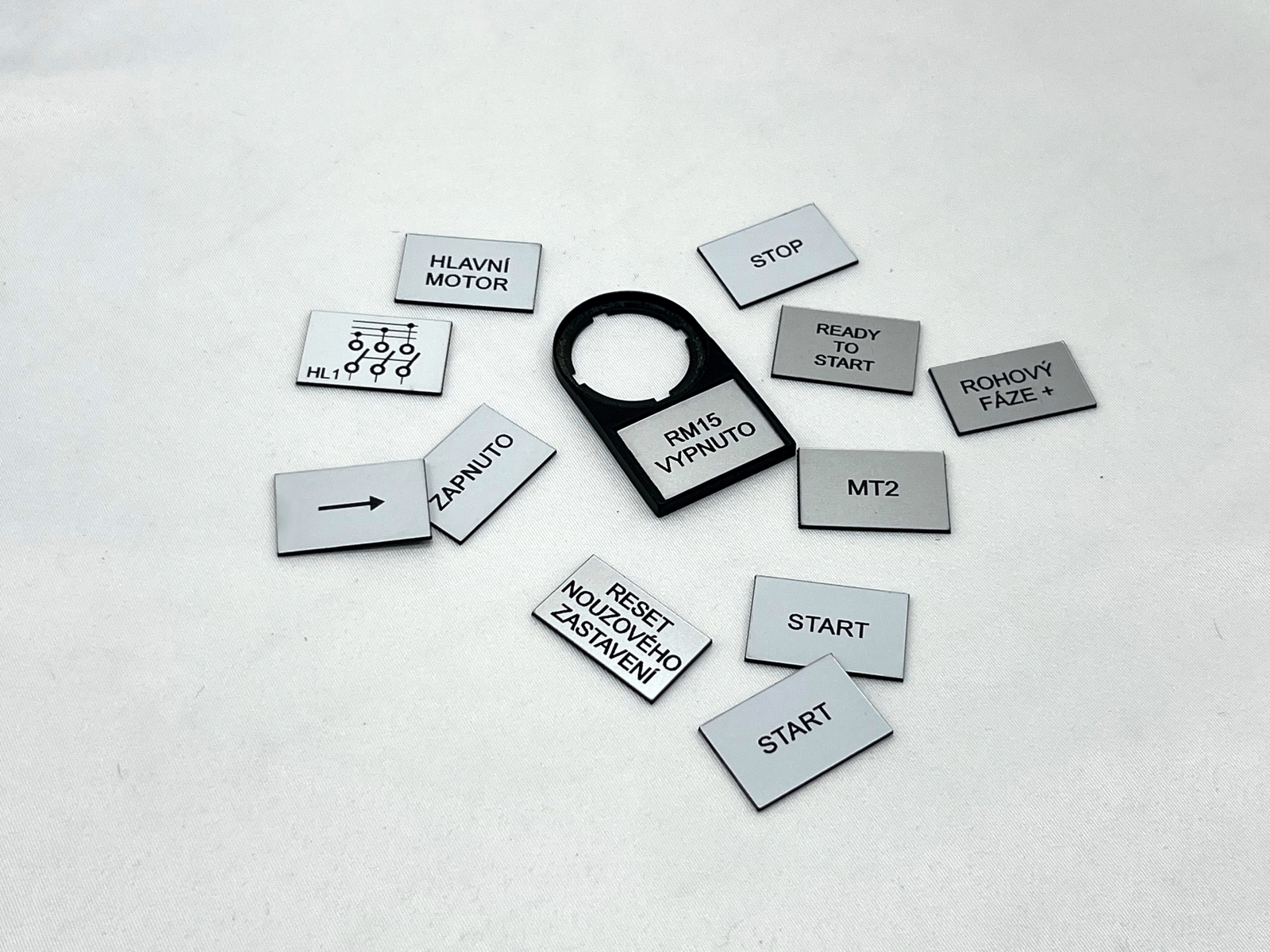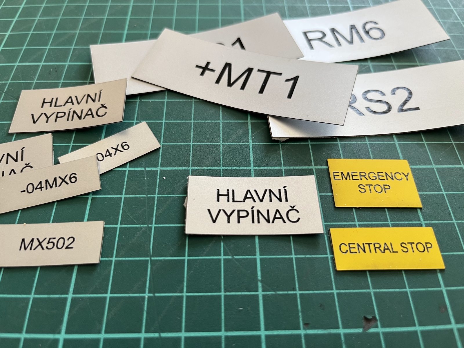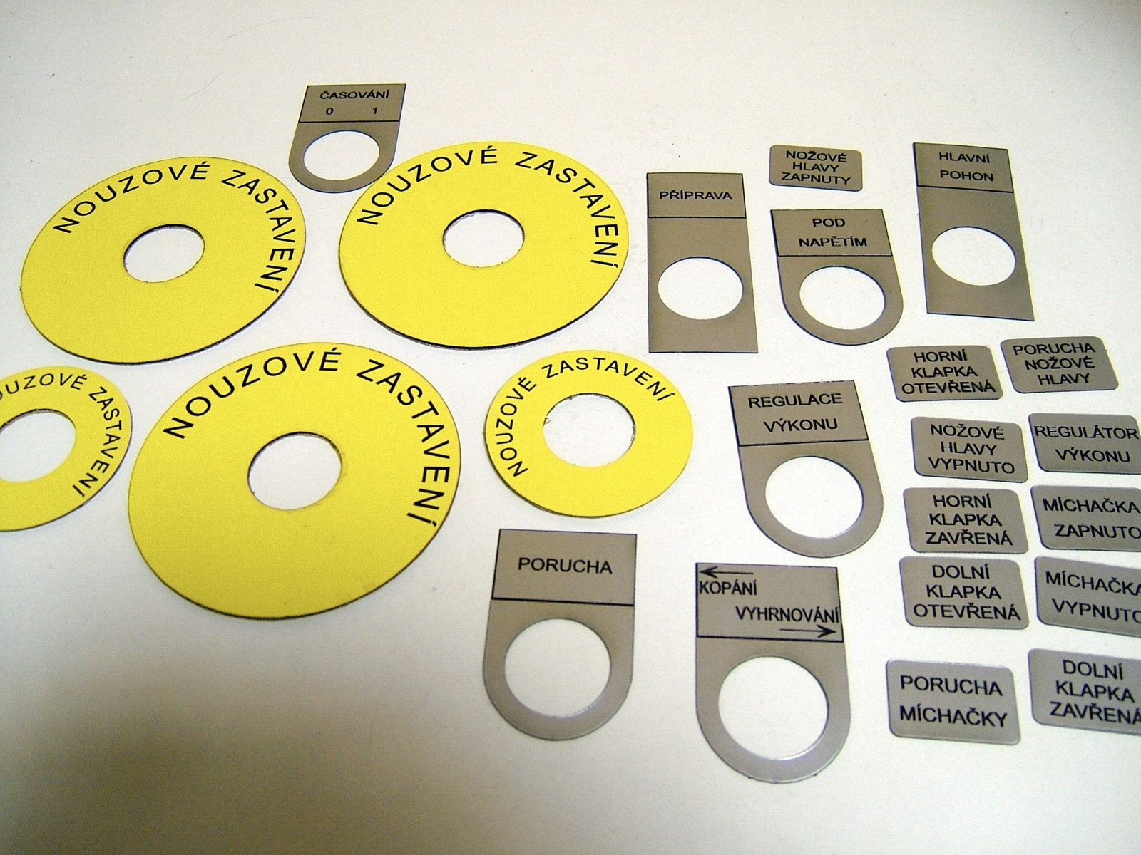 - Značení rozvaděčů a ovládacích prvků – Popisy tlačítek, funkcí a panelů pro technická zařízení a rozvaděče.