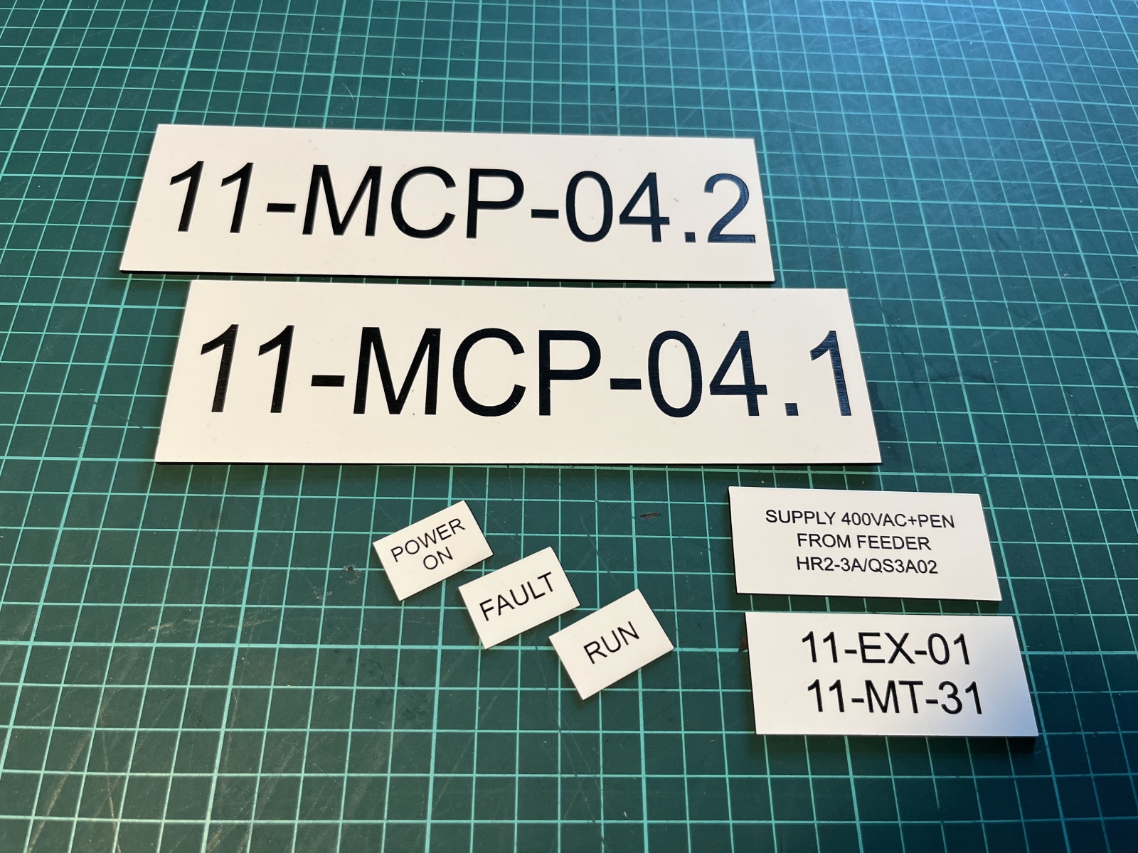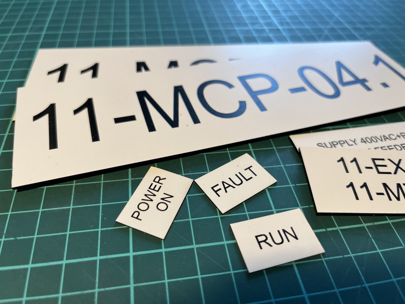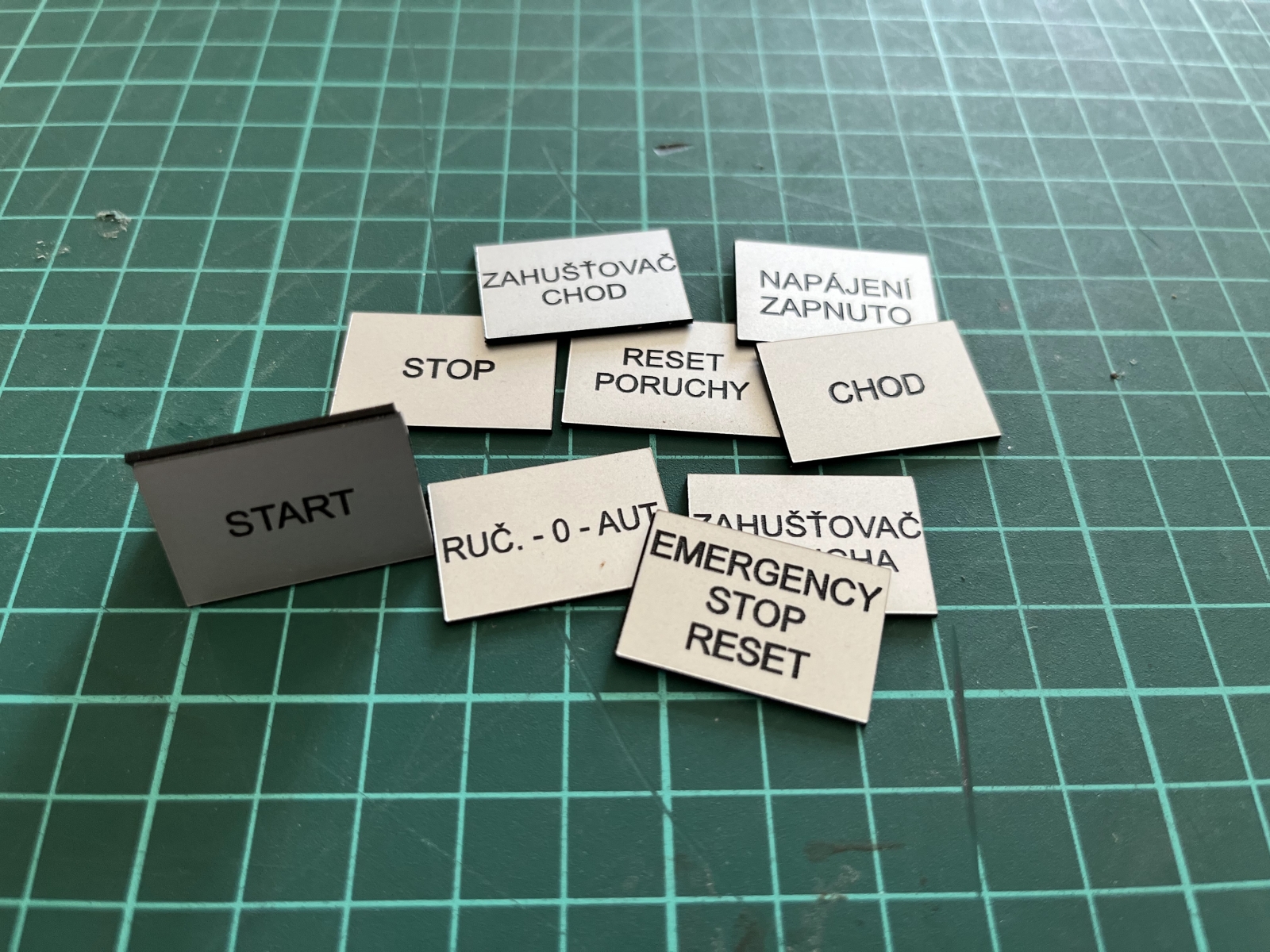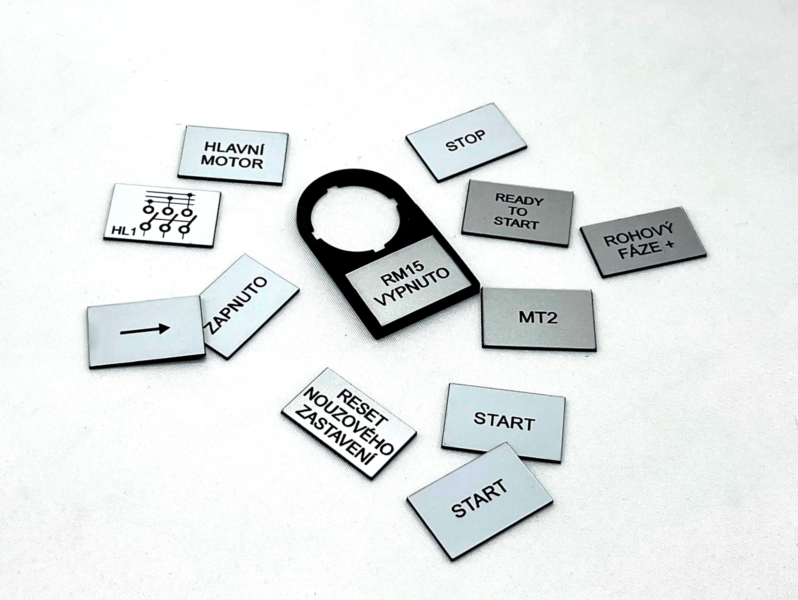 - Značení rozvaděčů a ovládacích prvků – Popisy tlačítek, funkcí a panelů pro technická zařízení a rozvaděče.